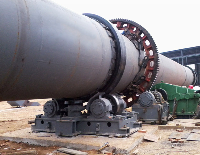 回轉(zhuǎn)窯簡體呈3%~3.5%的斜度安裝,并以1~2r/min慢速旋轉(zhuǎn),自窯尾端加入的物料沿窯體以翻滾及滑動的方式朝窯頭出料端移動,最后從出料端卸出。